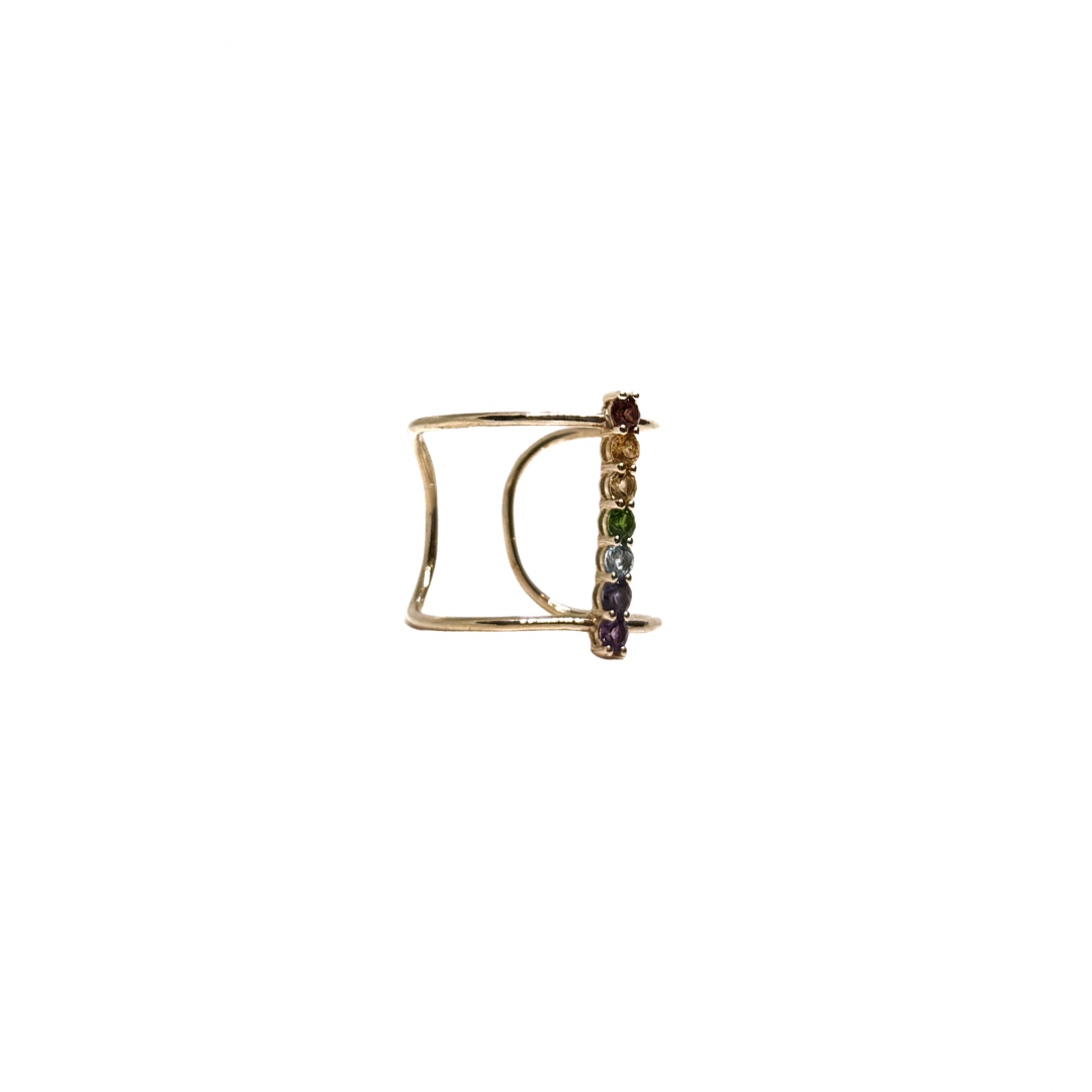 A modern and vibrant cuff ring crafted in 10K solid yellow gold, featuring a vertical row of multicolor semi-precious stones. Its open design adds a light, contemporary feel, making it perfect for stacking or wearing alone as a subtle pop of color. A timeless piece that blends elegance with everyday joy.