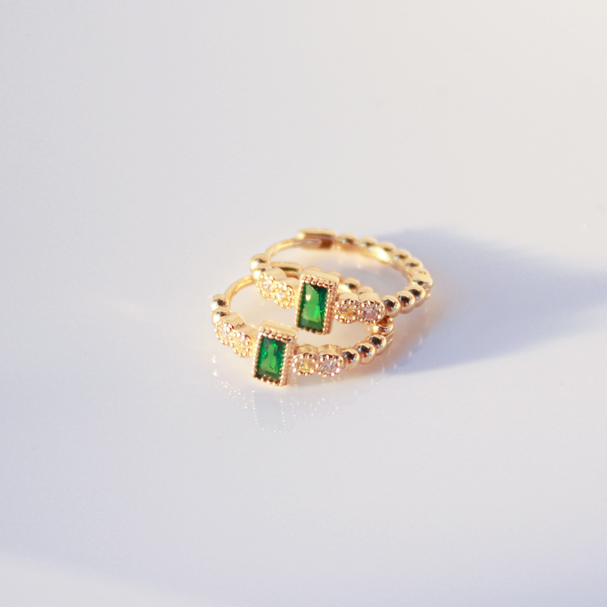 14K Solid Yellow Gold Green Square Stone with Cubic Zirconias Huggie Hoops