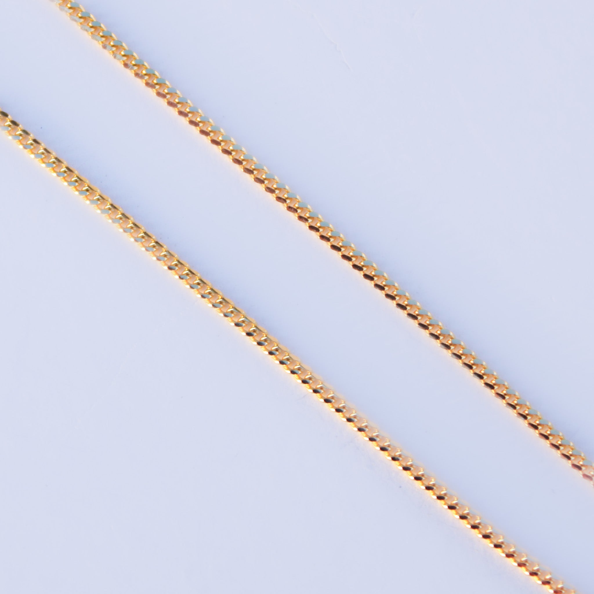 Delicate, classic, and versatile, this 14K solid yellow gold baby curb link chain necklace features small, interlocking flat links that lie smoothly against the skin. Perfect for layering with your favorite pendants or wearing alone, its subtle shine and lightweight design make it a timeless addition to any jewelry collection.