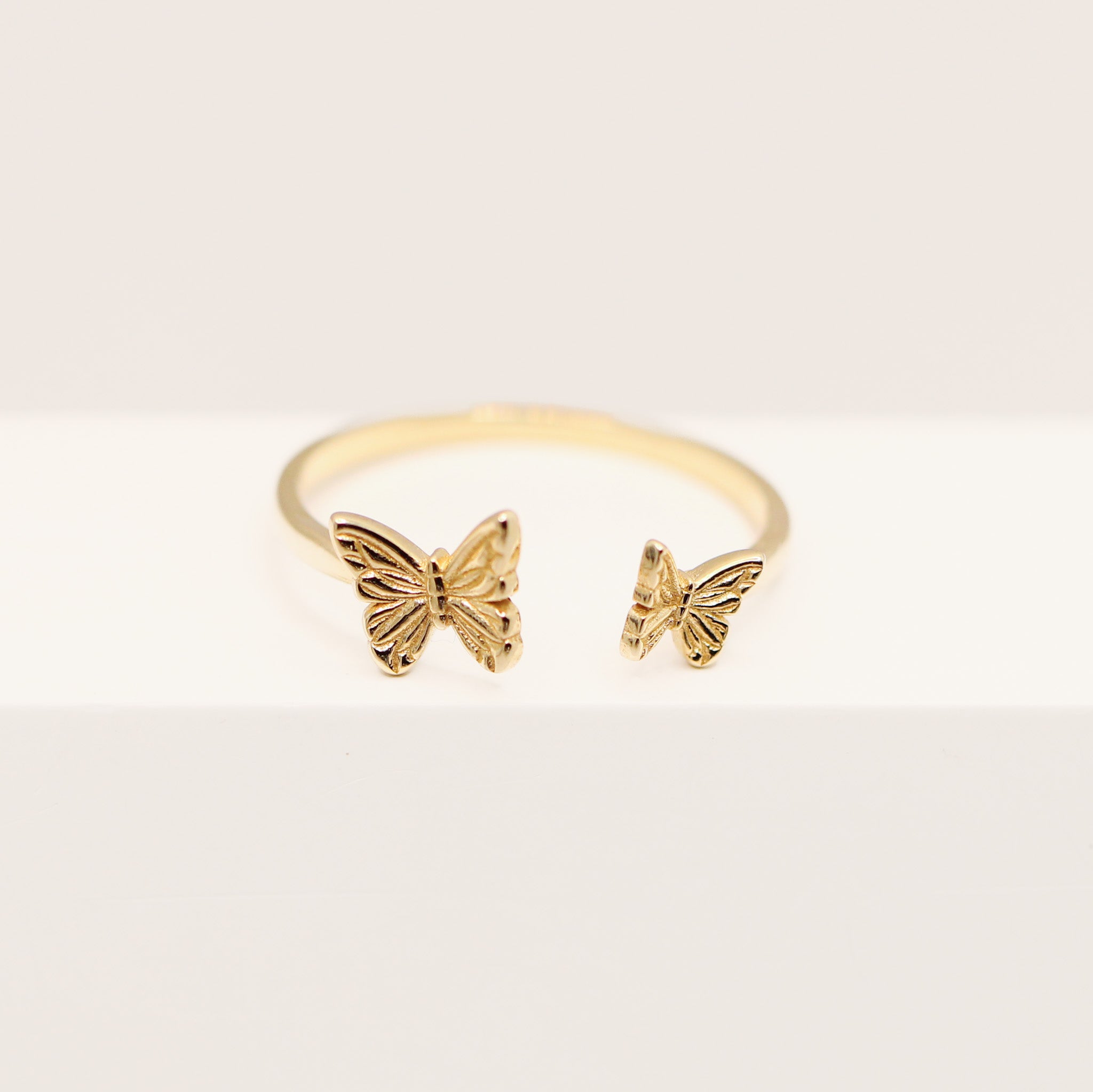 Delicate and whimsical — the 14K Solid Yellow Gold Butterflies Cuff Ring features intricately crafted butterfly motifs on a sleek, open cuff design. Made in solid 14K yellow gold, this ring brings a playful yet elegant touch to any outfit. Perfect for layering or wearing alone as a statement piece.