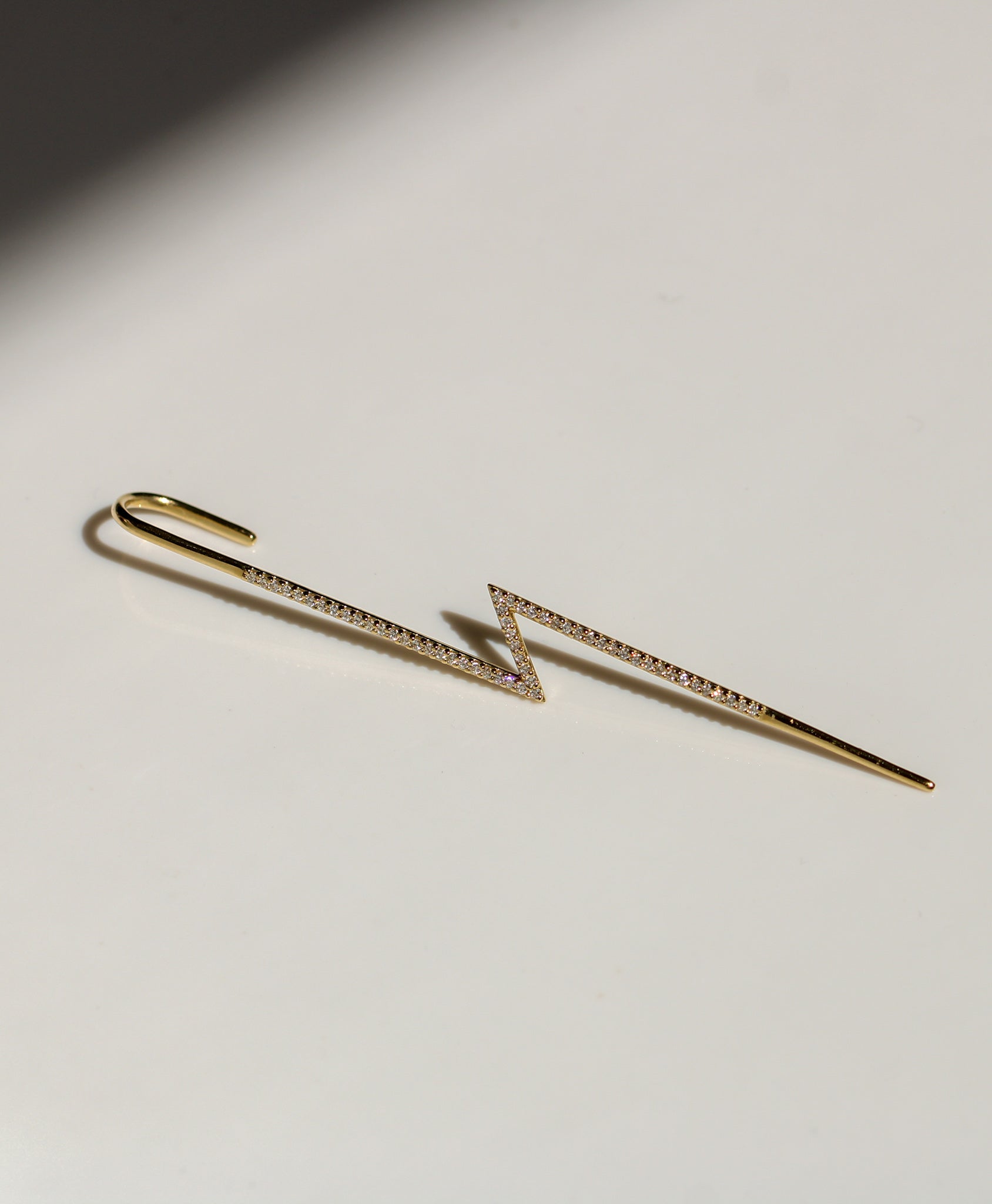 Electrify your look with this 14K Solid Yellow Gold Lightning Bolt Ear Pin, accented with sparkling diamonds for a touch of brilliance. Sleek and modern, it’s designed to slide comfortably onto your ear, adding edgy elegance without the need for multiple piercings.