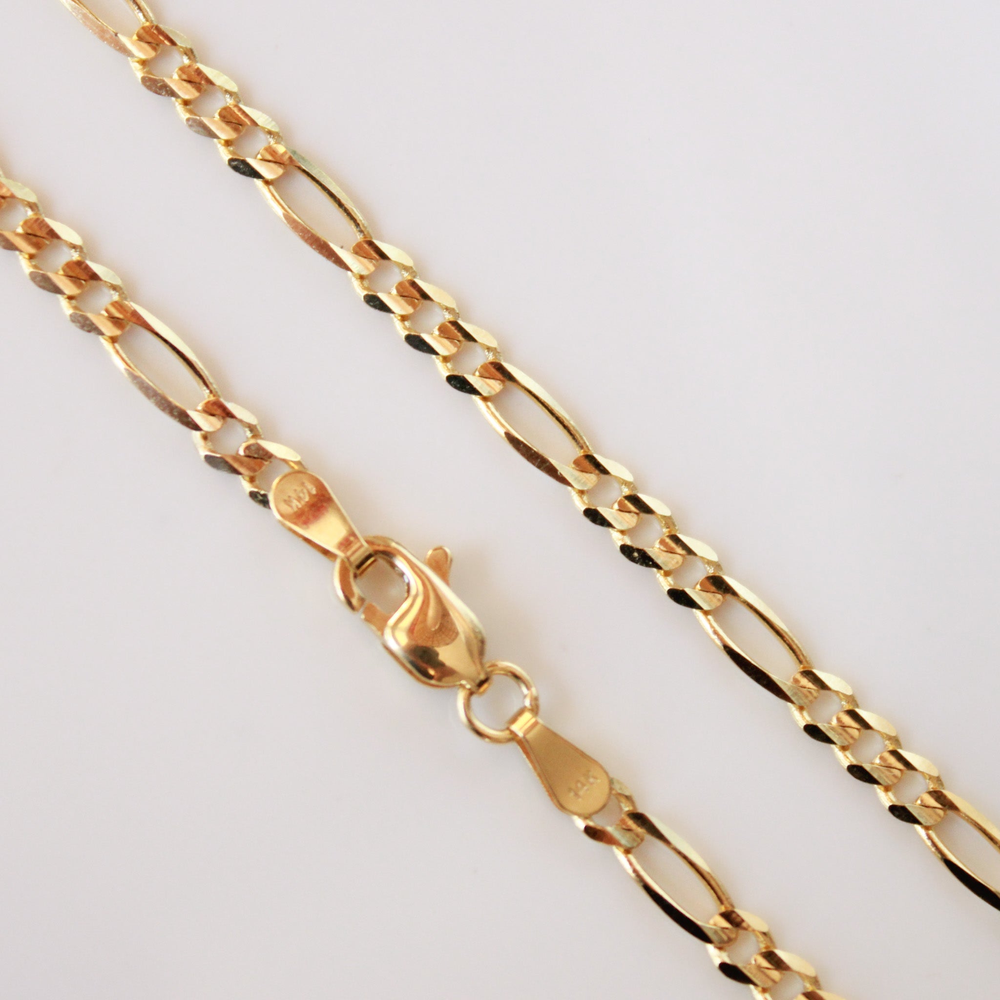 Classic, stylish, and versatile, this 14K solid yellow gold Figaro chain necklace features a pattern of alternating short and long links for a timeless design. Perfect for layering with pendants or wearing alone, its polished finish and durable craftsmanship make it a must-have addition to any jewelry collection.