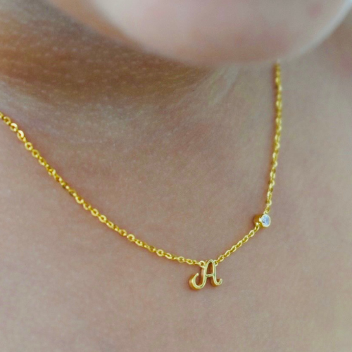 14K Solid Yellow Gold Initial Necklace with CZ Bezel