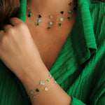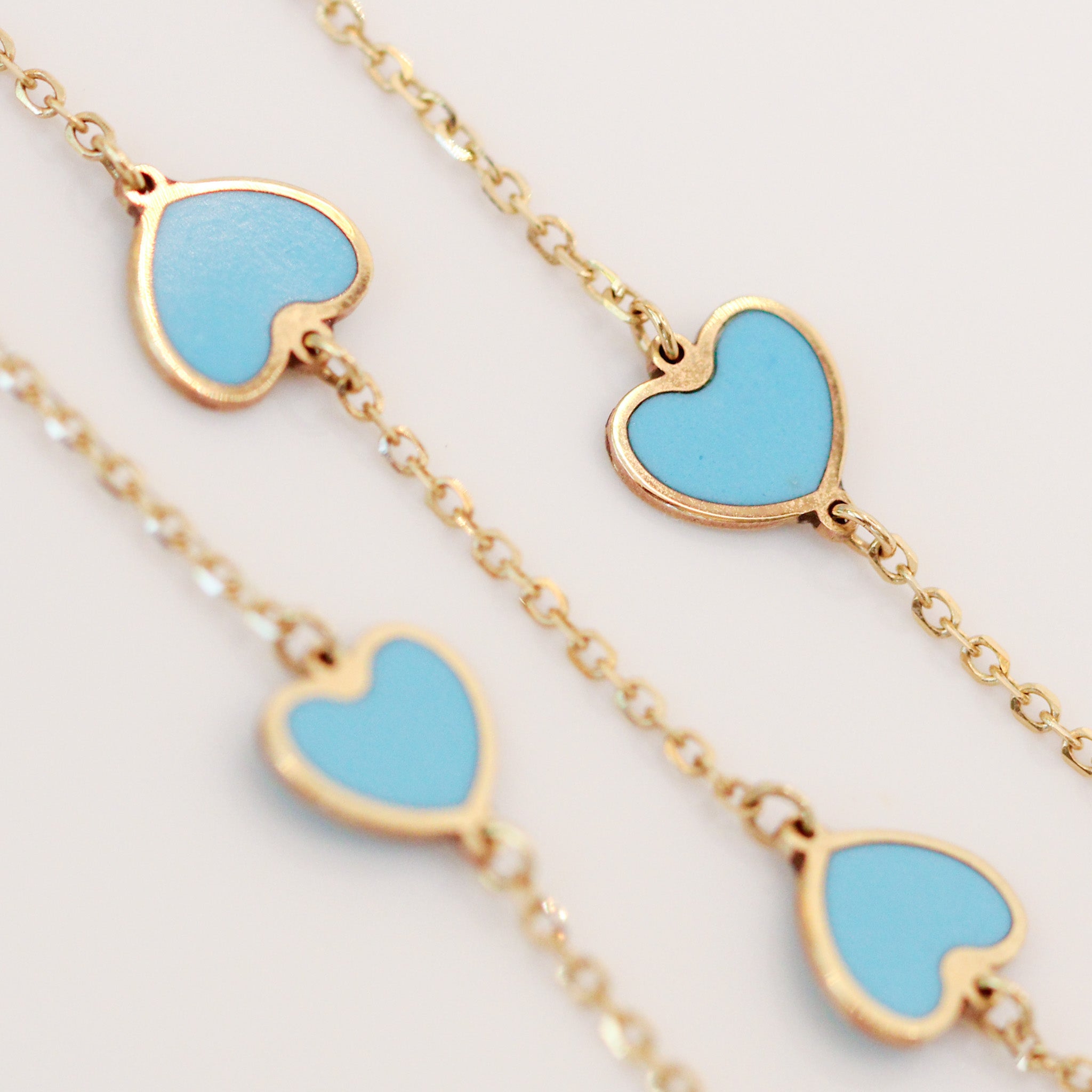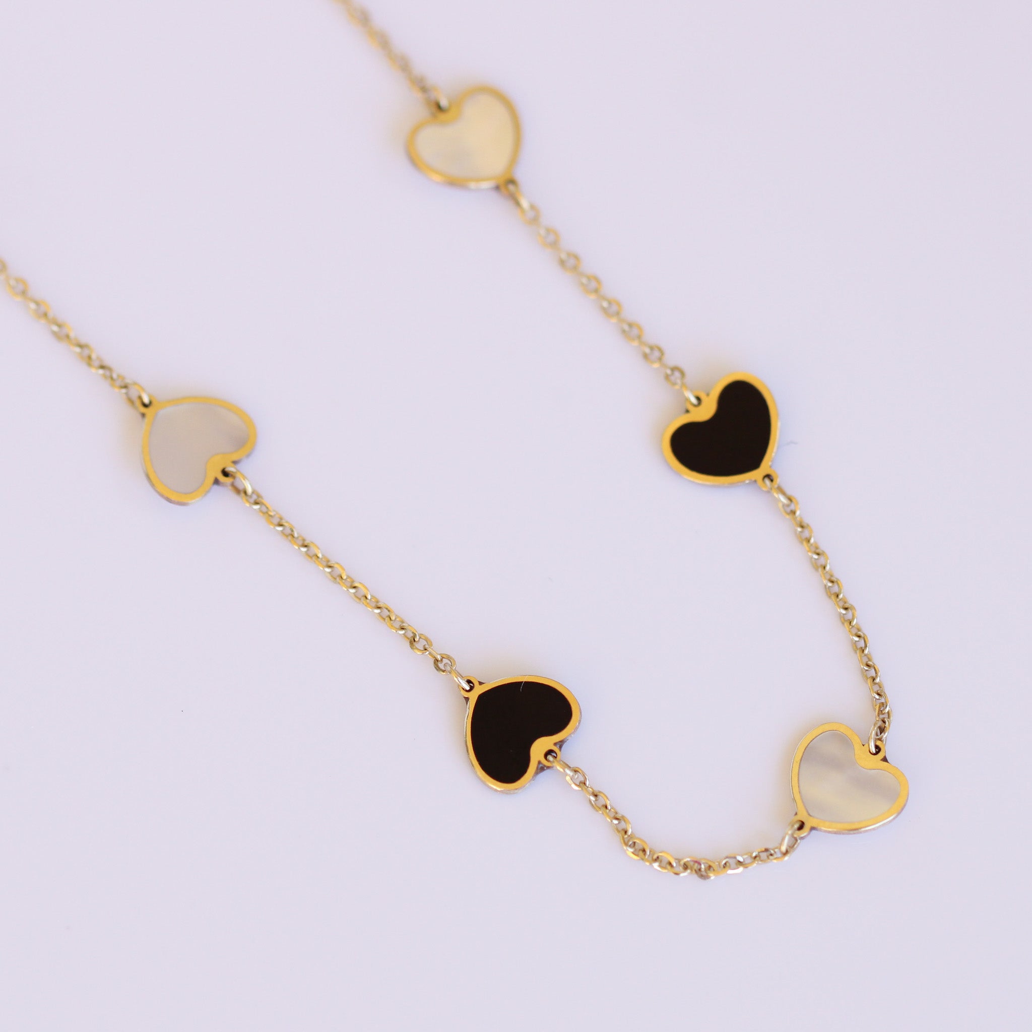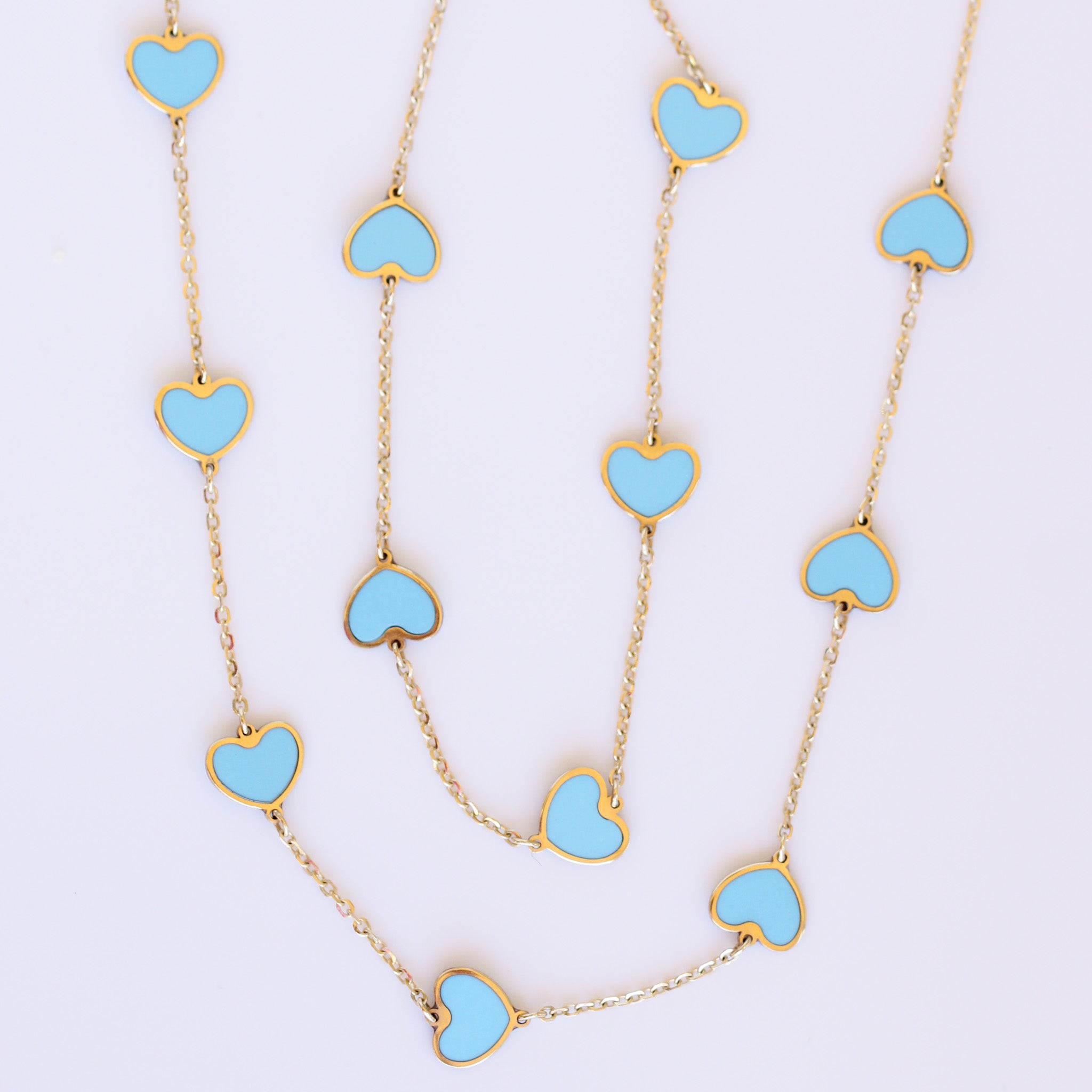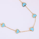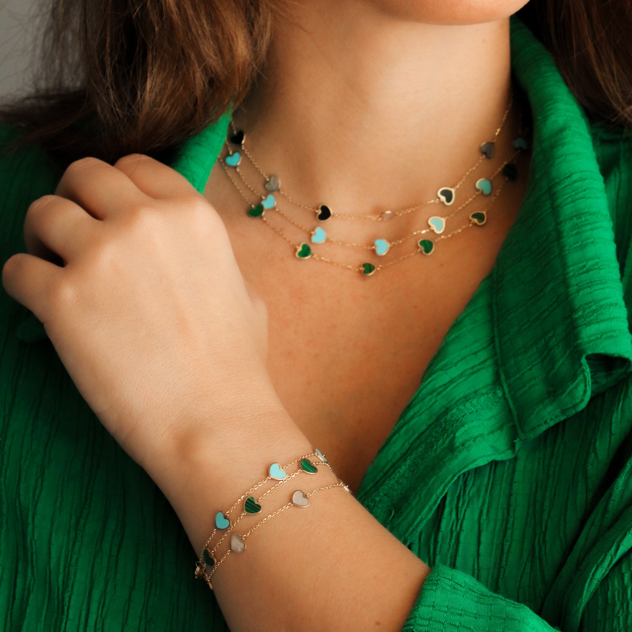 Elevate your everyday style with this 14K solid yellow gold multiple hearts necklace, featuring genuine turquoise, malachite, onyx, and mother of pearl. A timeless piece that adds color, meaning, and elegance to any look—perfect for layering or wearing solo.