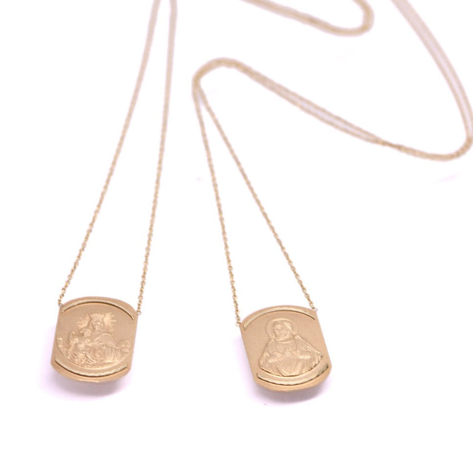 Carry faith close to your heart with this timeless 14K solid yellow gold scapular necklace. Featuring a delicate and detailed scapular pendant, this necklace is designed for everyday wear while serving as a meaningful symbol of devotion. Its elegant craftsmanship and classic design make it a treasured piece for yourself or a thoughtful gift for someone special. Why You’ll Love It: This necklace blends faith and style, offering a subtle yet meaningful accessory for daily wear. Its solid gold construction ensures lasting beauty, making it perfect for gifting on religious milestones, birthdays, or as a personal keepsake.