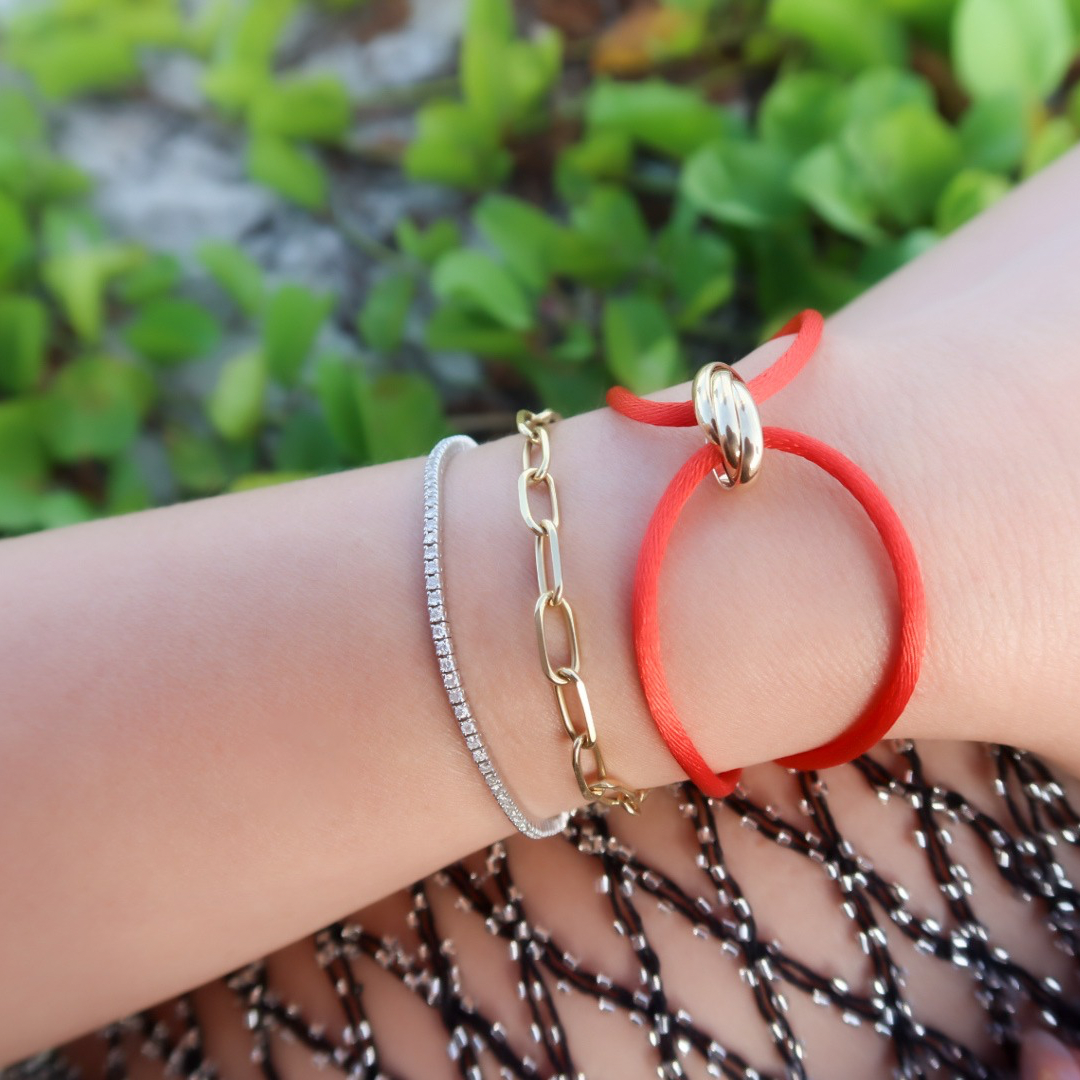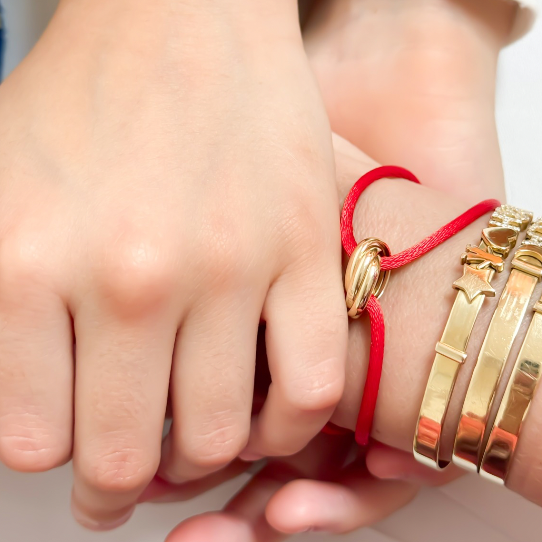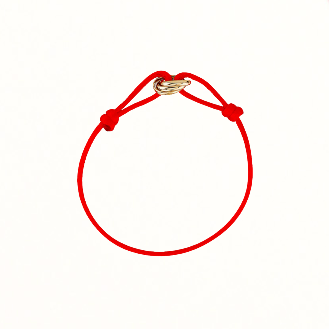 Add a touch of elegance and meaning to any outfit with this 14K solid yellow gold Trinity bracelet. Featuring a vibrant red silk cord and polished gold accents, this adjustable unisex bracelet is designed to fit comfortably on any wrist. Its minimalist yet striking design makes it perfect for layering or wearing alone as a statement piece. A versatile accessory for daily wear, special occasions, or as a meaningful gift.