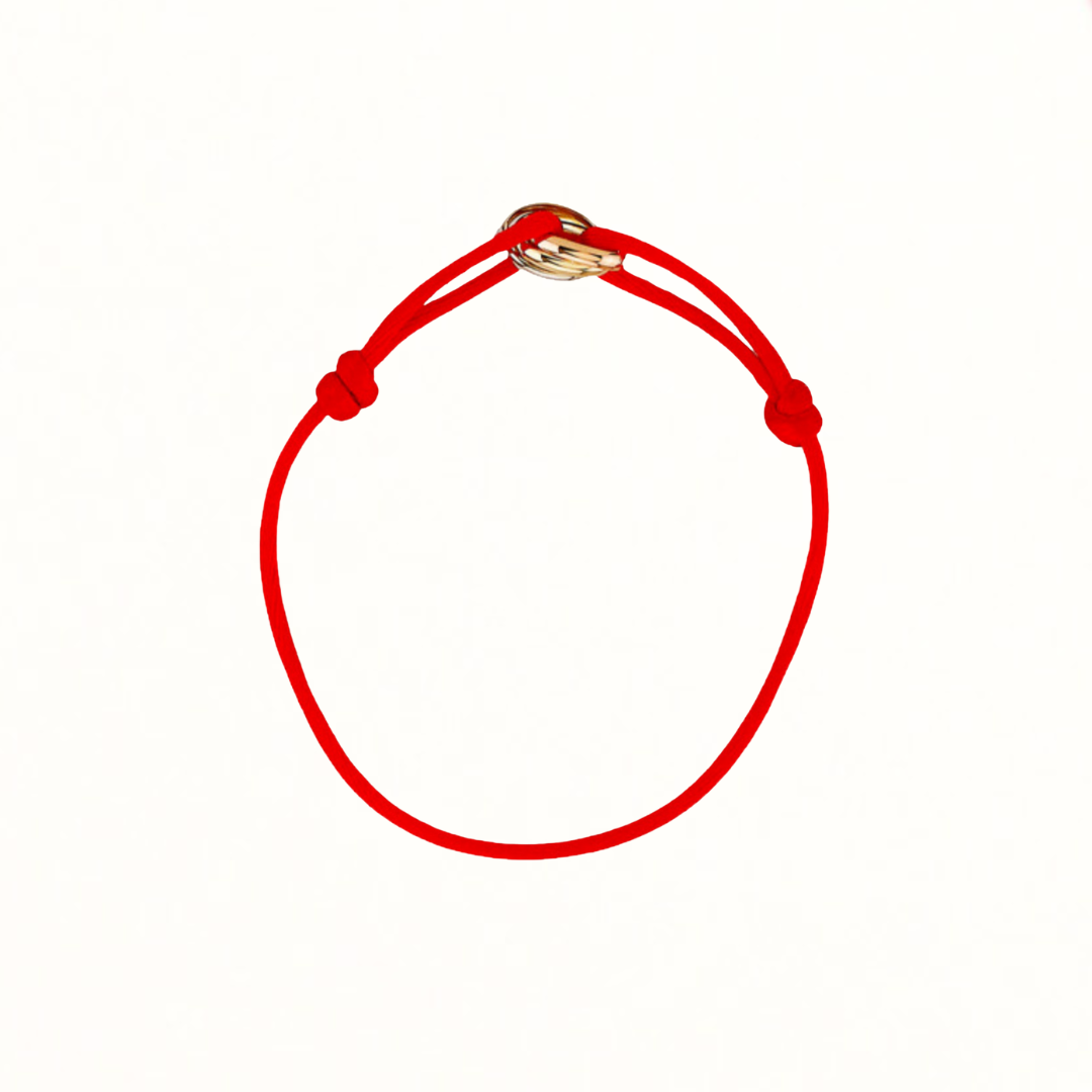 Bring a pop of color and a touch of sophistication to your everyday look with this 14K solid trinity gold bracelet. Featuring yellow, rose, and white gold accents on a vibrant red silk cord, this adjustable unisex bracelet combines elegance with versatility. Its minimalist yet striking design allows for comfortable layering or standalone wear, making it a perfect accessory for any occasion. A meaningful and stylish gift for yourself or a loved one.