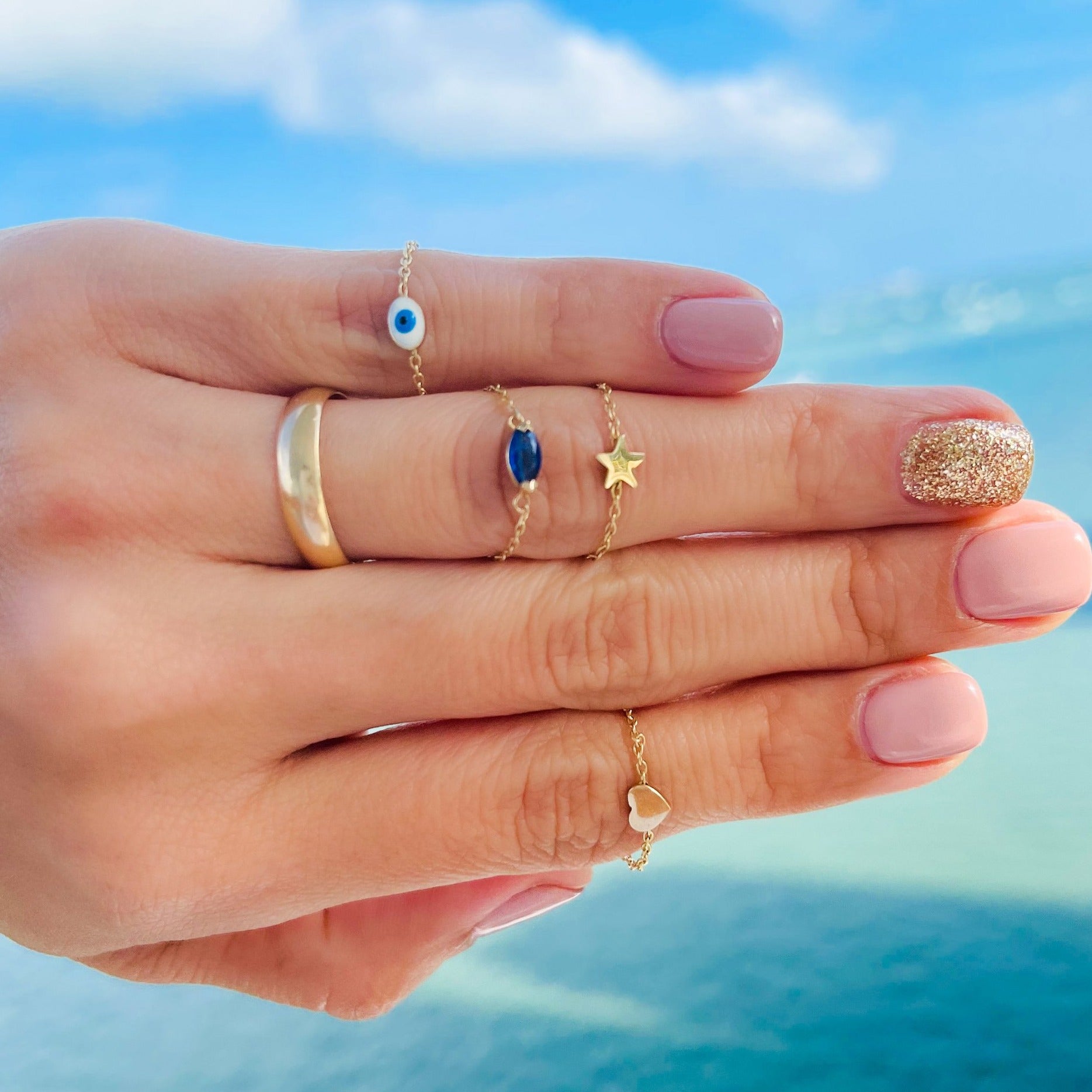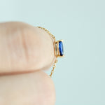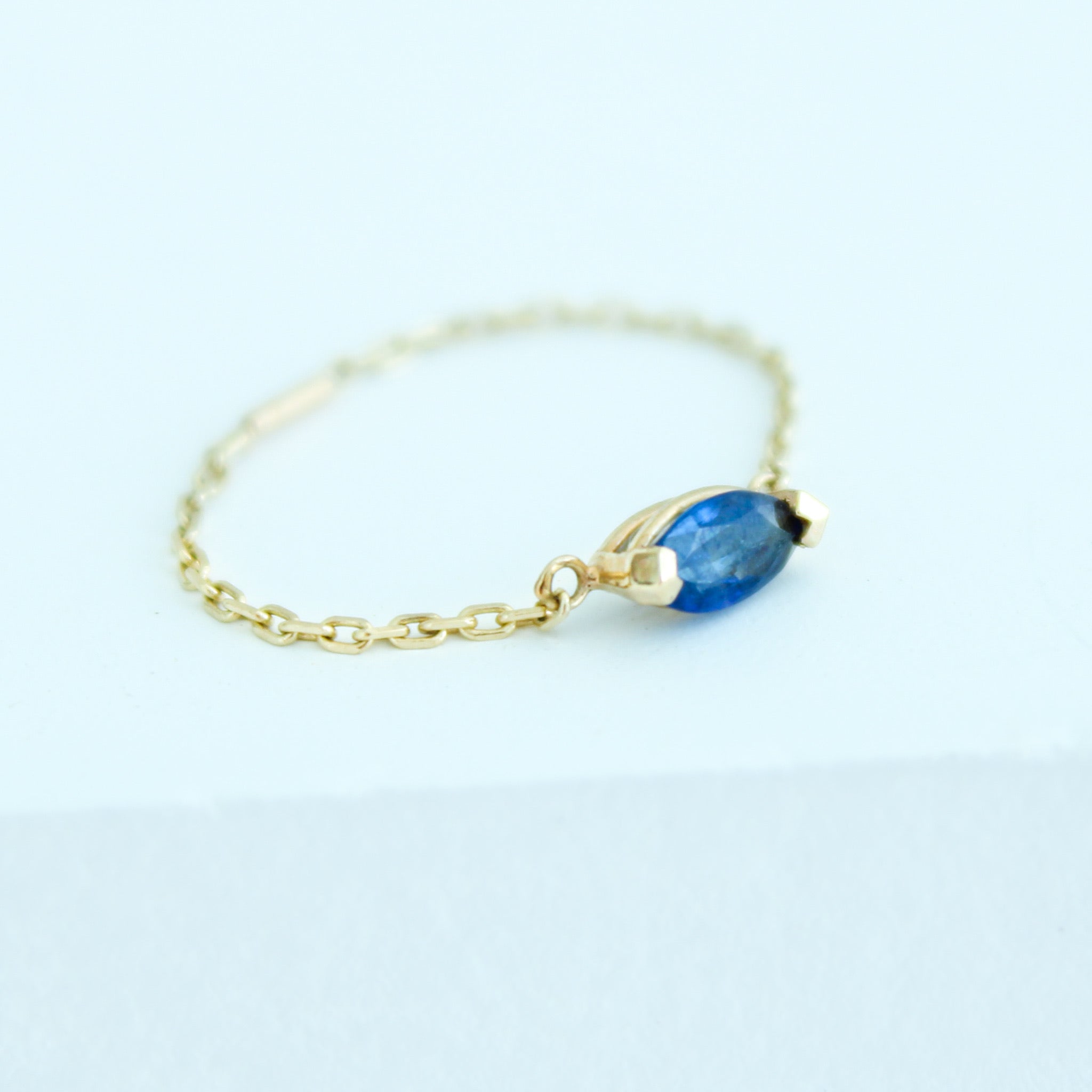 Refined and effortlessly chic, our 14K Solid Yellow Gold Chain Ring with Marquise Sapphire brings a touch of subtle sparkle to any look. Handcrafted in luminous 14K solid yellow gold, this unique design features a flexible chain band crowned with a striking marquise-cut sapphire. Perfect for stacking or wearing solo, it delivers both elegance and modern edge in one versatile piece.