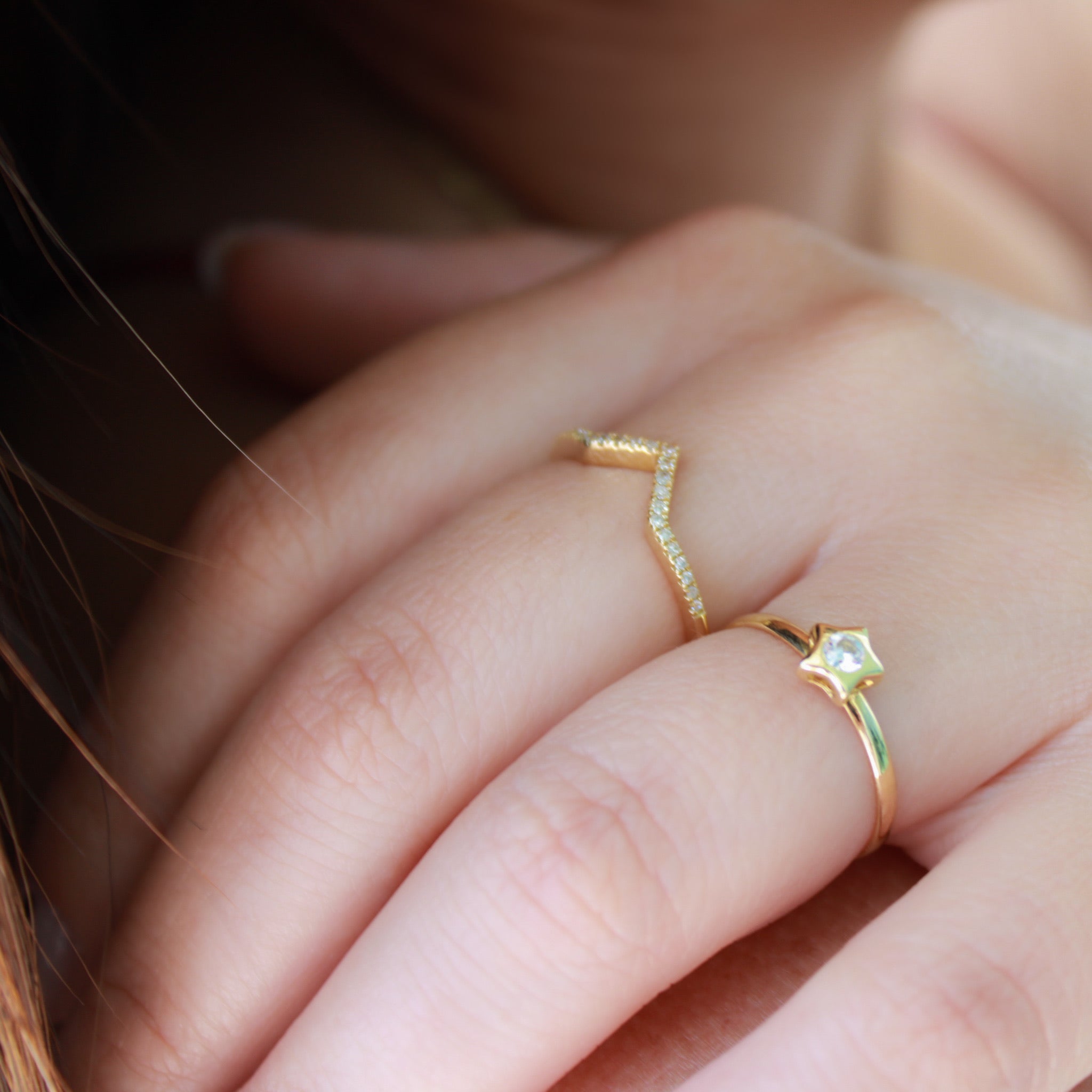 Sparkling and celestial — the 14K Solid Yellow Gold Cubic Zirconia Star Ring features a delicate star design adorned with dazzling cubic zirconia, crafted in luxurious 14K yellow gold. Perfect for stacking or wearing alone, this ring adds a touch of sparkle and whimsical elegance to any jewelry collection.