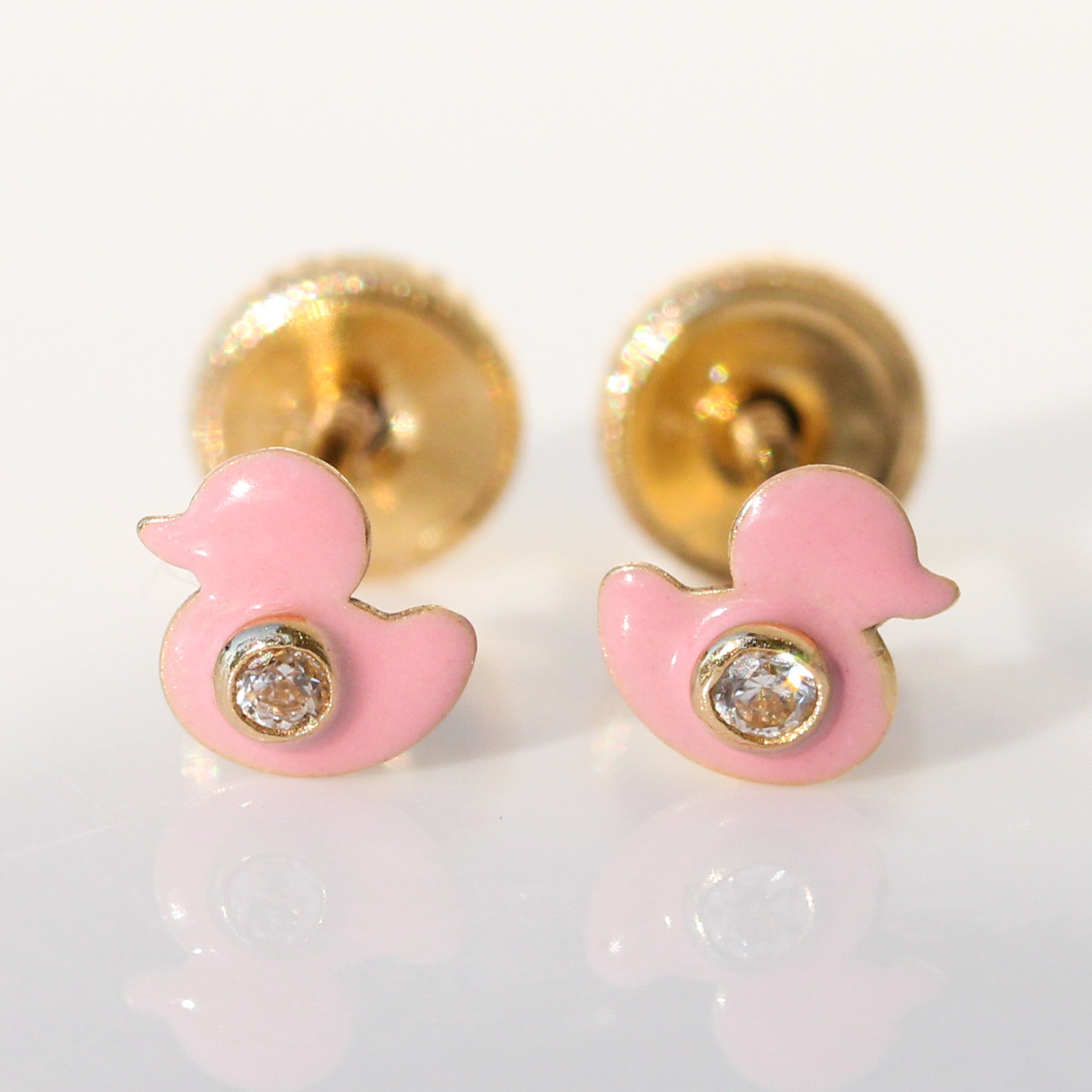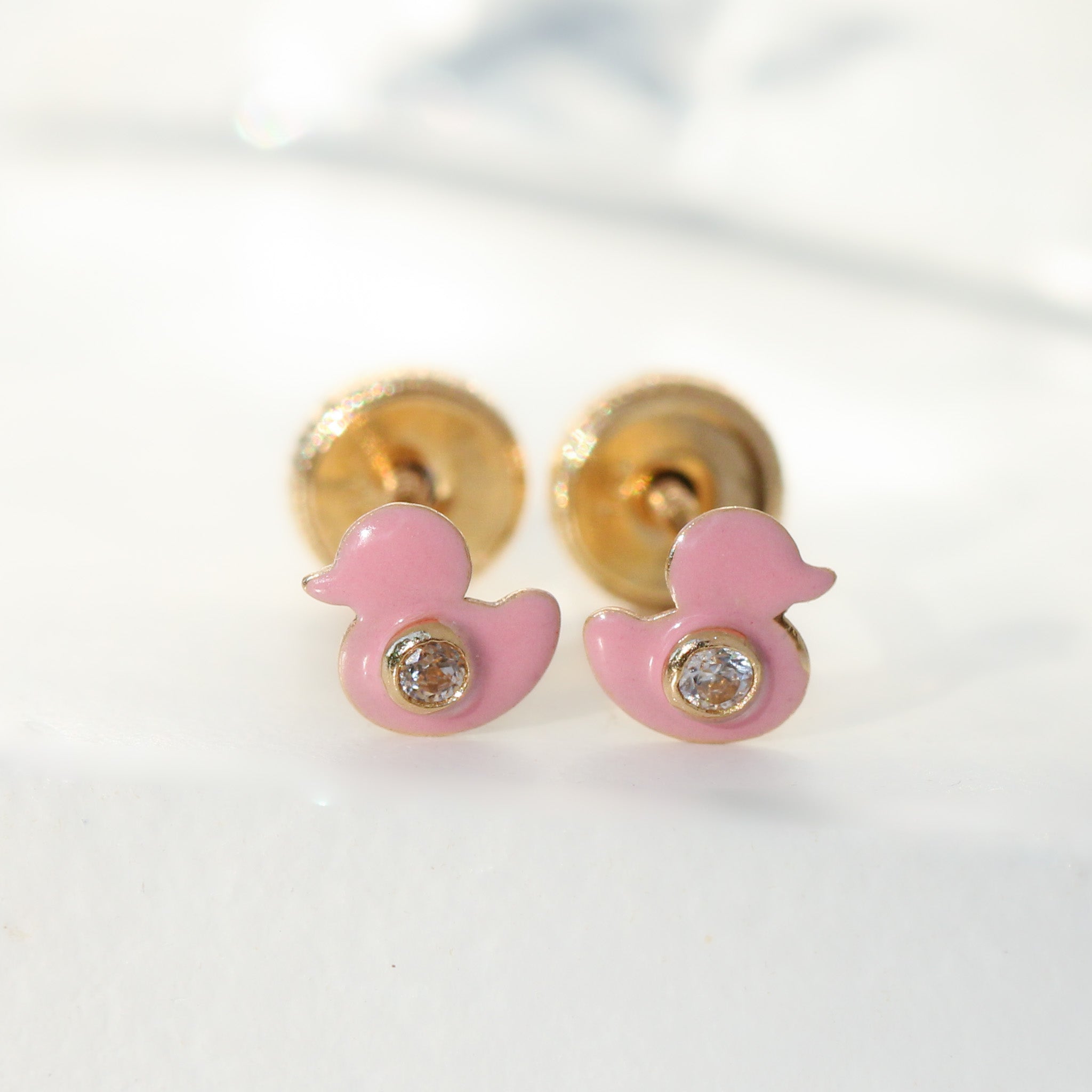 14K Yellow Gold Pink Enamel Mini Duck Earrings