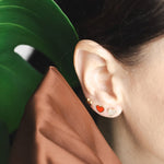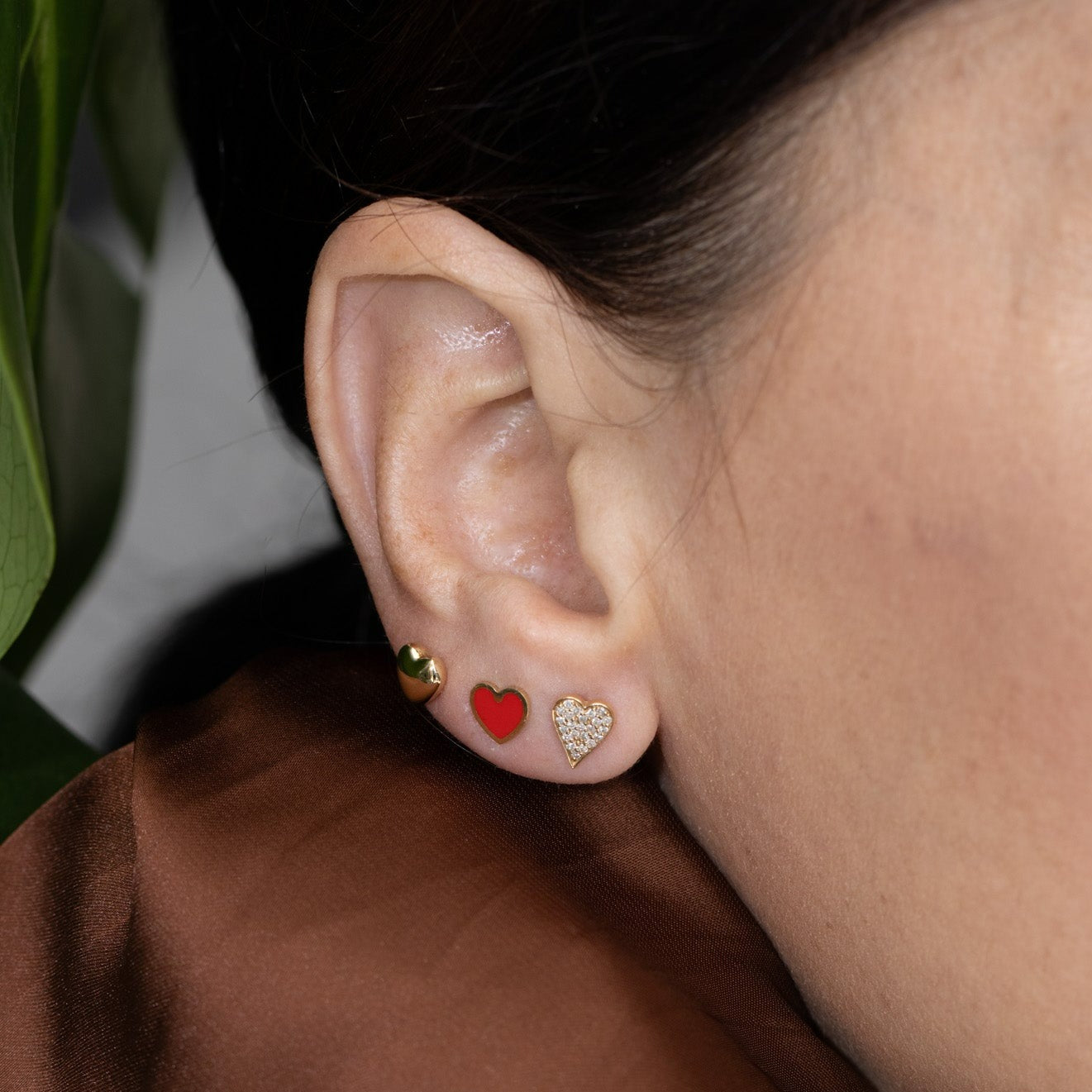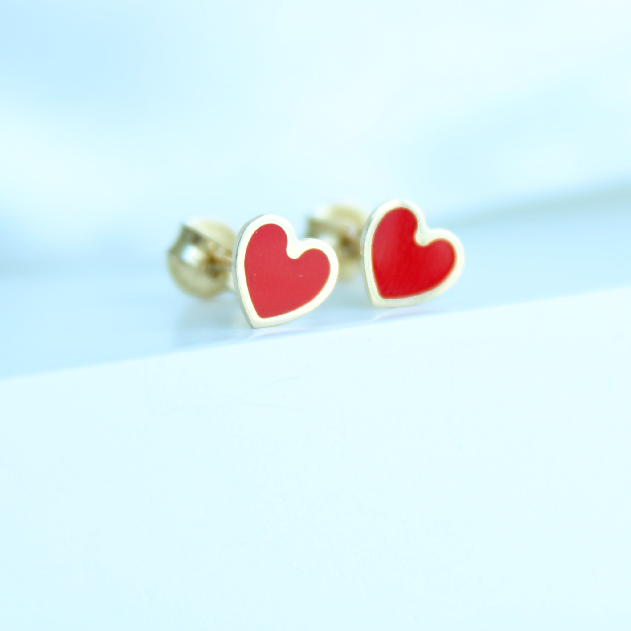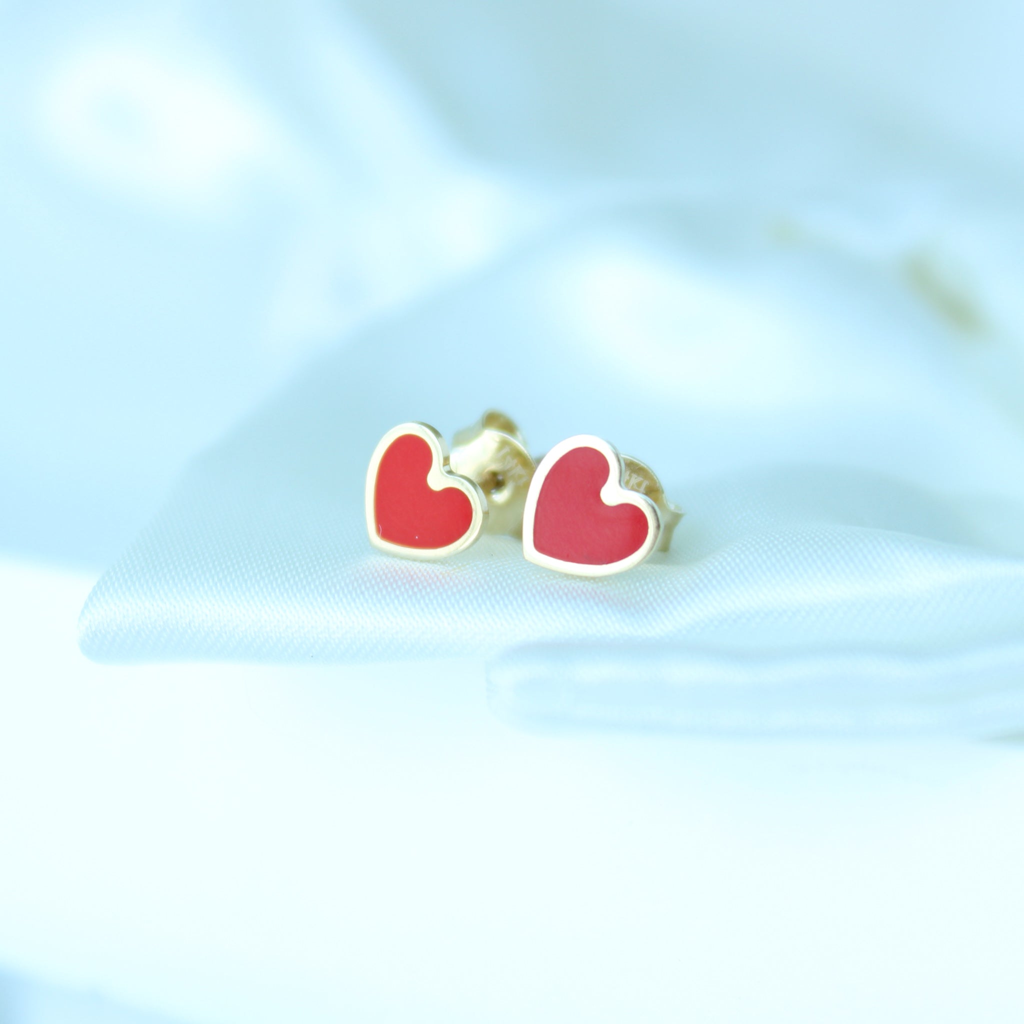 14K Solid Yellow Gold Red Enamel Heart Earrings