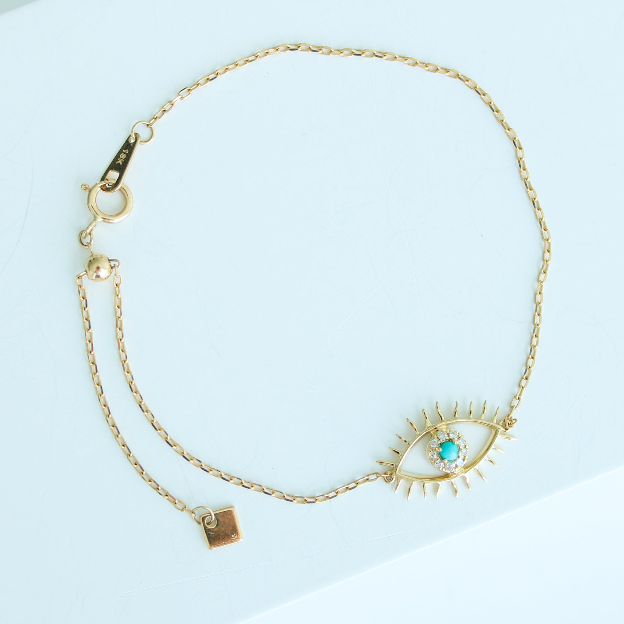 18K Solid Yellow Gold Diamond and Turquoise Evil Eye Bracelet