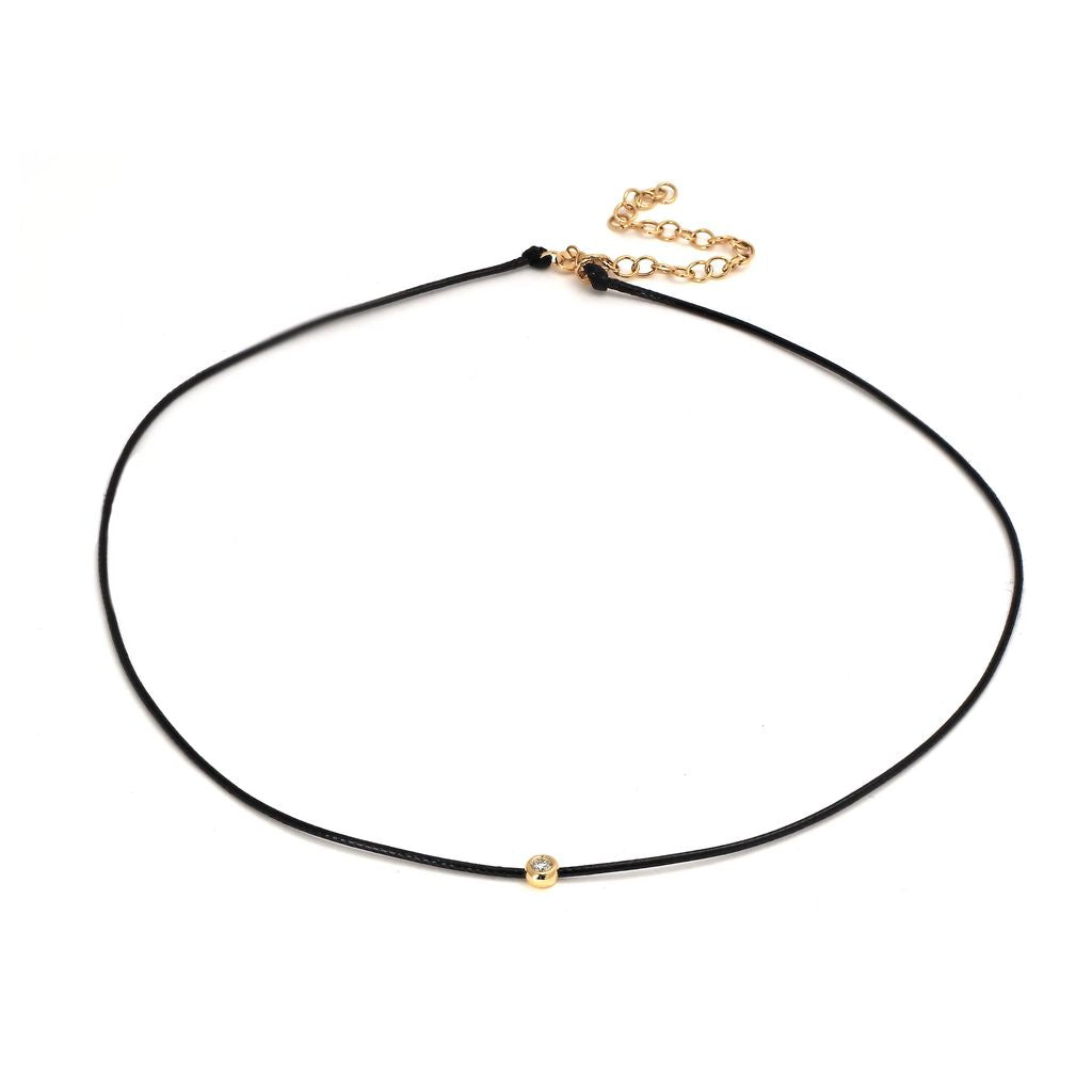 14K Solid Yellow Gold Diamond Bezel Leather Cord Necklace