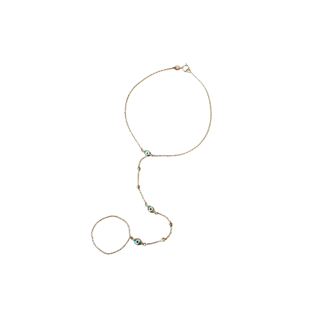 A delicate and protective statement piece. This 14K solid yellow gold clon hand chain bracelet features an open evil eye charm accented with turquoise enamel and diamond-cut beads for radiant sparkle. Designed to sit comfortably across the hand, it adds a meaningful and stylish touch to your everyday look. Perfect for layering or wearing solo as a signature piece.