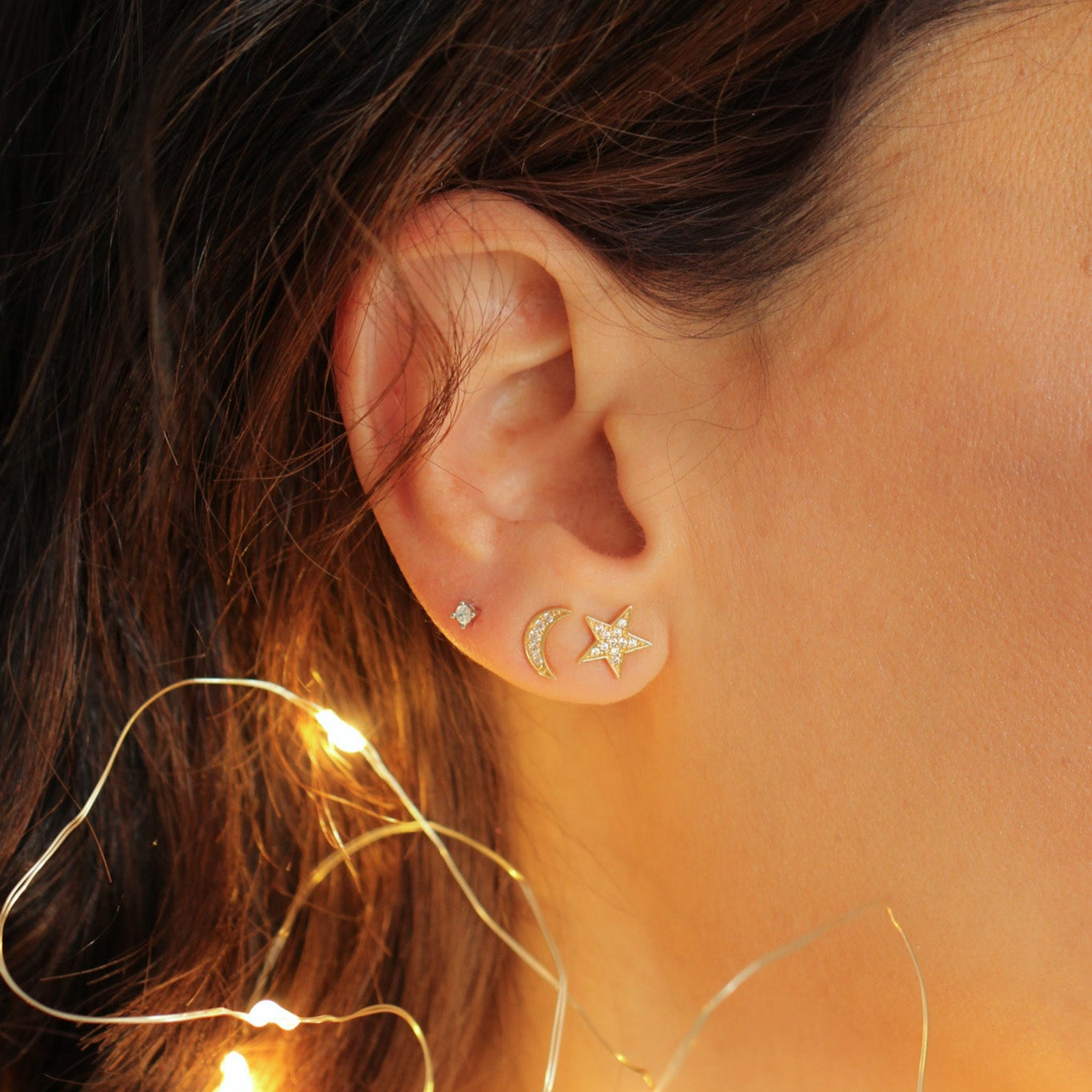 Add a whimsical celestial touch to your ear stack with these 14K solid gold mismatched studs, featuring a sparkling star and crescent moon design accented with cubic zirconia (CZ). Perfect for mixing, matching, and layering, these studs bring a playful yet elegant vibe to any look. Lightweight and versatile, they’re ideal for everyday wear or as a standout statement pair.