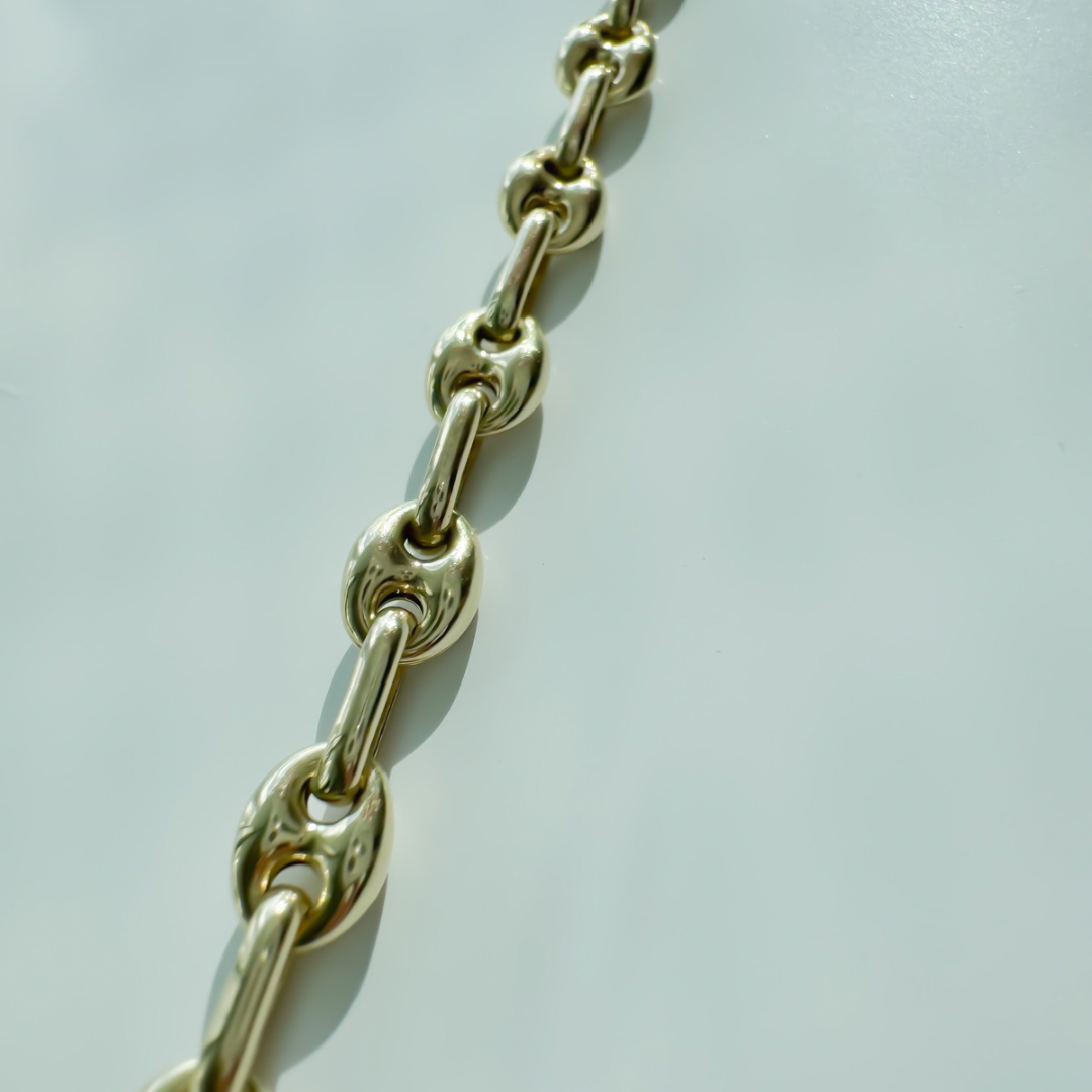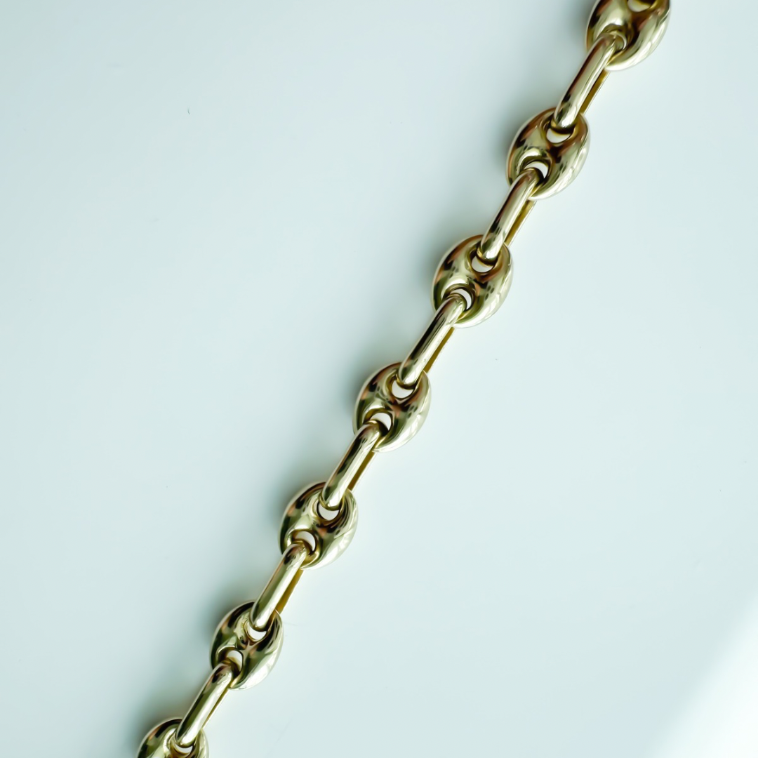 Make a statement with this 14K solid yellow gold Marine Puff bracelet. Featuring 8mm puffed links and a secure round Italian lock, this piece combines durability with effortless elegance. Its polished finish catches the light beautifully, making it perfect for layering or wearing alone as a timeless statement. Ideal for everyday wear or special occasions, this bracelet adds refined sophistication to any jewelry collection.