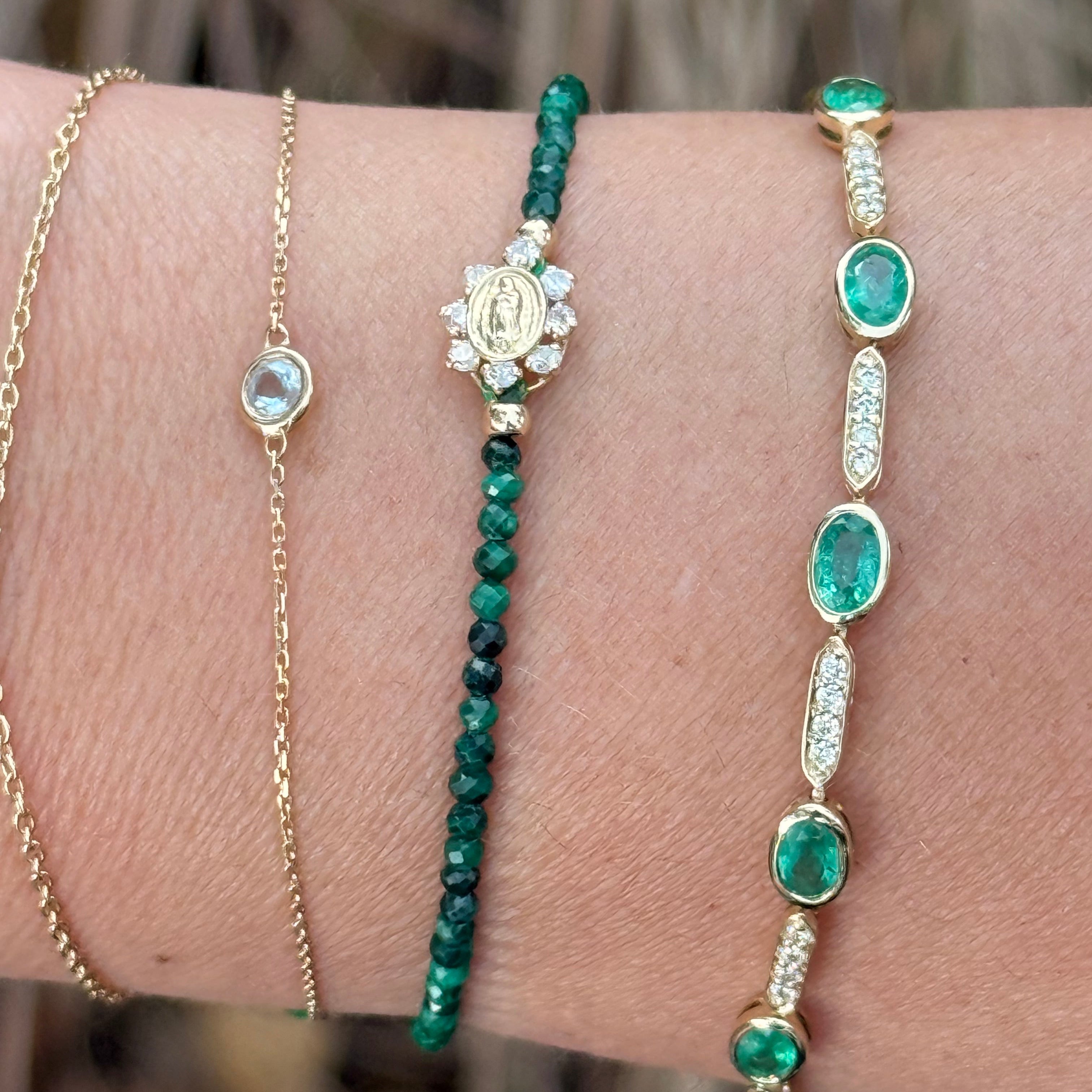 Close-up of a wrist wearing three green gemstone bracelets with a blurred natural background